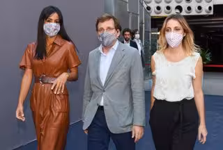 (I-D) La vicealcaldesa de Madrid y miembro del Comité Permanente de Cs, Begoña Villacís; el alcalde de Madrid, José Luis Martínez-Almeida; y la delegada del Área de Cultura, Turismo y Deporte, Andrea Levy, a su llegada al acto en el que suscriben la ren