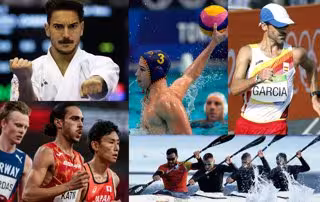 De izquierda a derecha y de arriba abajo, el karateca Damián Quintero, el waterpolista Álvaro Granados, el marchador Jesús Ángel García Bragado, el atleta Mohamed Katir y el K4 de Saúl Craviotto, Marcus Cooper Walz, Carlos Arévalo y Rodrigo Germade