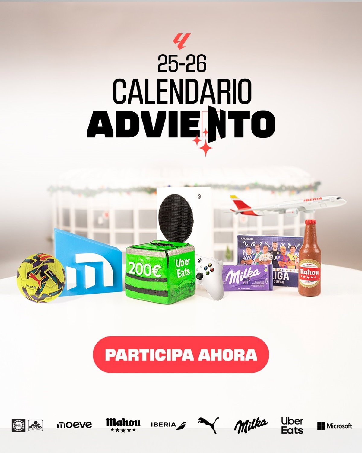 Del 1 al 24 de diciembre, cualquier usuario puede participar diariamente en miliga.laliga.com/adviento, donde se sorteará un premio distinto cada día. En total habrá 102 ganadores, incluyendo numerosas experiencias dobles pensadas para disfrutar en familia o con amigos.