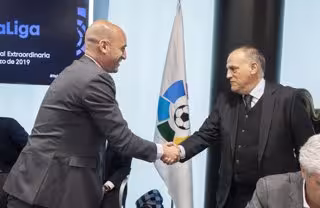 Luis Rubiales, presidente de la Real Federación Española de Fútbol (RFEF), con el presidente de LaLiga, Javier Tebas