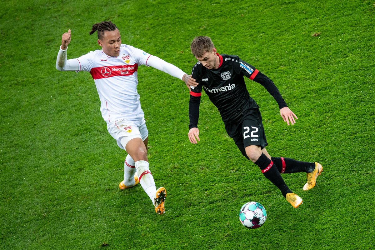 Archivo - 06 February 2021, Leverkusen: Leverkusen's Daley Sinkgraven (r) and Stuttgart's Roberto Massimo battle for the ball during the German Bundesliga soccer match between Bayer Leverkusen and VfB Stuttgart at BayArena. Photo: Marius Becker/dpa-Pool