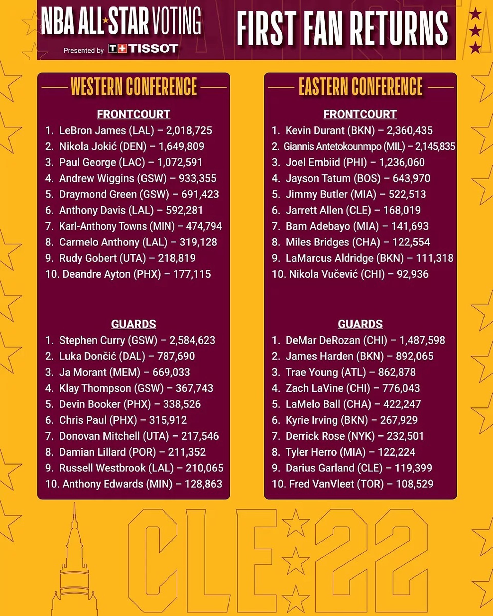 Ambos jugadores serían los capitanes -después del primer recuento de votos-, de la Conferencia Oeste y Este, respectivamente, y de elegir los equipos para el partido de las estrellas de la NBA. Además de Curry y Durant también aparecen con muchos apoyos Lebron James (2.018.725) y Giannis Antetokounmpo (2.145.835).