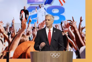 Archivo - COSTA NAVARINO, March 20, 2025  -- Reynold Hoover, CEO of the 2028 Los Angeles Olympics Organizing Committee, speaks during the second day of the 144th International Olympic Committee (IOC) session in Costa Navarino, Greece, March 20, 2025.