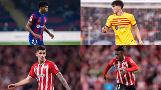 Los jugadores del FC Barcelona Lamine Yamal y Pau Cubarsí, y los del Athletic Club Oihan Sancet y Nico Williams.