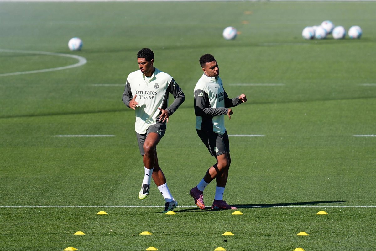 Archivo - Jude Bellingham and Kylian Mbappe of Real Madrid CF warm up during the training day of Real Madrid ahead the Spanish League, LaLiga EA Sports, football match against Levante UD at Ciudad Deportiva Real Madrid on September 22, 2025, in Valdebebas - Dennis Agyeman / AFP7 / Europa Press - Archivo