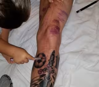 El hijo de Lionel Messi se entretiene dibujando sobre los tatuajes de la pierna izquierda del jugador. Y la encargada de mostrarlo ha sido su esposa, Antonella Rocuzzo.
