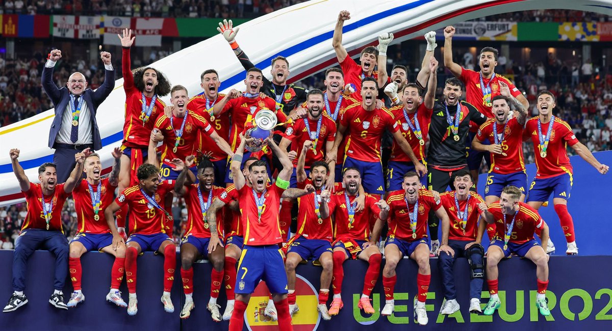 Archivo - 14 July 2024, Berlin: Spain players celebrate with the trophy after winning the UEFA Euro 2024 final soccer match against England at the Olympic Stadium. Photo: Christian Charisius/dpa