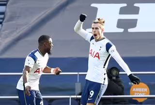 28 February 2021, United Kingdom, London: Tottenham Hotspur's Gareth Bale (R) celebrates scoring his side's fourth goal during the English Premier League soccer match between Tottenham Hotspur and Burnley at the Tottenham Hotspur Stadium. Photo: Daniel - Daniel Leal Olivas/PA Wire/dpa