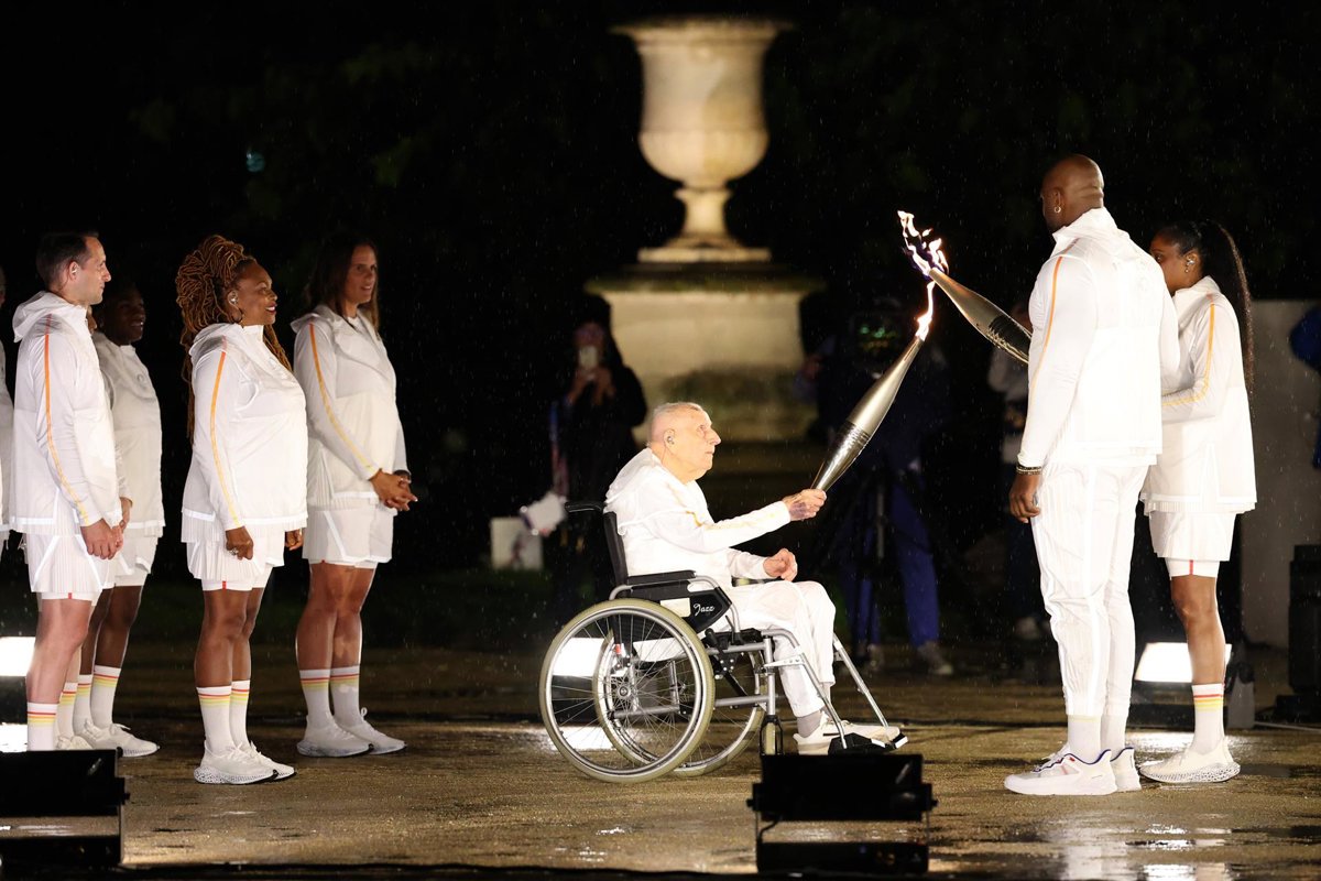 Archivo - 26 July 2024, France, Paris: Former cyclist Charles Coste, hands over the Olympic flame to Marie-Jose Perec and Teddy Riner during the opening ceremony of the Paris 2024 Olympic Games. Photo: Jan Woitas/dpa-Pool/dpa - Jan Woitas/dpa-Pool/dpa - Archivo