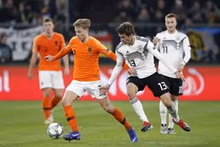 Archivo - Netherlands player Frenkie de Jong (L) and Germany player Thomas Muller (R) during the UEFA Nations League, League A, Group 1 football match between Germany and Netherlands on November 19, 2018 at Veltins Arena in Gelsenkirchen, Germany - Phot - STANLEY GONTHA / PRO SHOTS / DPP / AFP7 - Archivo
