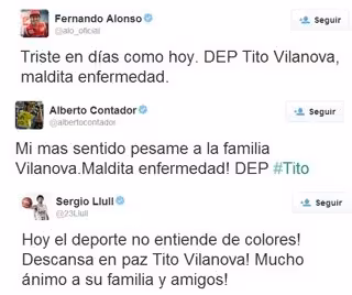 "Triste en días como hoy. DEP Tito Vilanova, maldita enfermedad", escribió en la red social Twitter el piloto asturiano de Ferrari Fernando Alonso. Su compañero en la escudería italiana como probador, Pedro Martínez de la Rosa, también se unió al luto. "Triste por la muerte de Tito Vilanova, con sólo 45 años... Un abrazo a su familia", escribió.