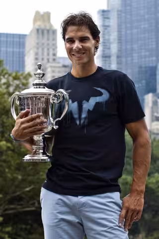 El tenista español Rafael Nadal sonríe con el trofeo del Abierto de Estados Unid
