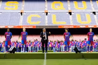 Presentación de la nueva indumentaria del FC Barcelona para la temporada 2021/22, con Ansu Fati, Caroline Graham Hansen, el presidente Joan Laporta, Riqui Puig y Marta Torrejón en primera fila, y una coral de 221 personas ataviadas con la equipación