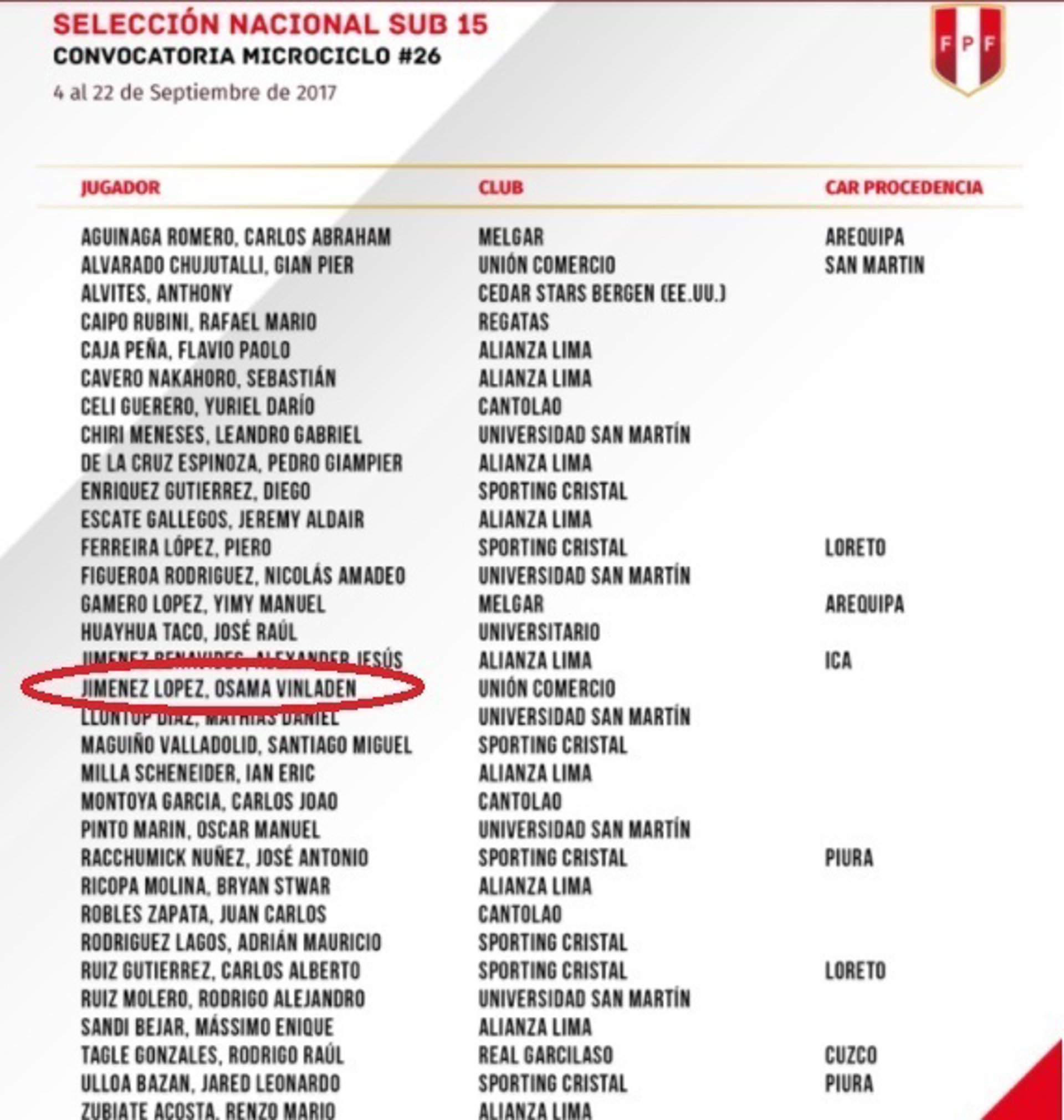El mundo del fútbol se ha quedado sorprendido con un jugador peruano, no por sus dotes en el campo, sino por su nombre. Osama Vinladen, todo junto y con v, es el nombre de uno de los jugadores que participan en el preparatorio de Perú para el Sudamericano Sub 15.