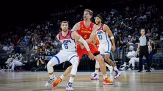 Zach LaVine defiende a Pau Gasol durante el amistoso entre las selecciones de los Estados Unidos y España previo a los Juegos de Tokio