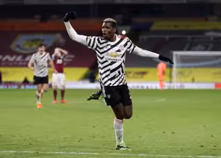 12 January 2021, England, Burnley: Manchester United's Paul Pogba celebrates scoring his side's first goal during the English Premier League soccer match between Burnley and Manchester United at Turf Moor. Photo: Clive Brunskill/PA Wire/dpa - Clive Brunskill/PA Wire/dpa