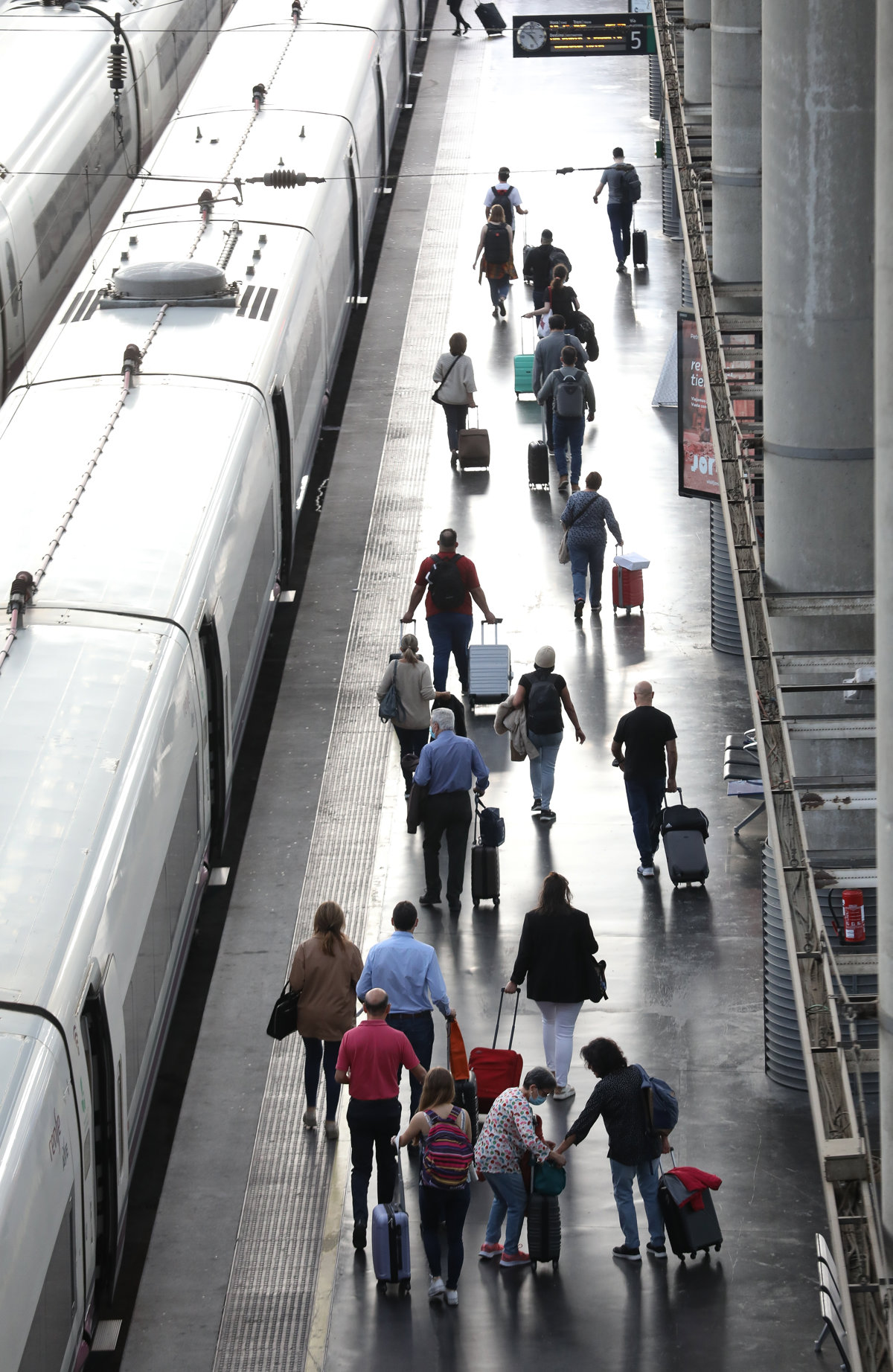 Varios pasajeros con maletas en el andén de un tren en la estación de Puerta de Atocha, a 28 de octubre de 2022, en Madrid (España). Con motivo del próximo puente de Todos los Santos, la compra de billetes de tren se ha disparado un 124%, según las vent - Marta Fernández Jara - Europa Press