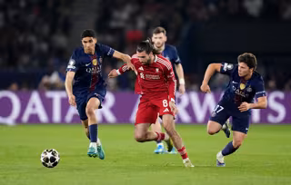 08 April 2026, France, Paris: Liverpool's Dominik Szoboszlai (C) battles for the ball with Paris Saint-Germain's Achraf Hakimi (L) and Joao Neves (R) during the UEFA Champions League quarter-final first leg soccer match between Paris Saint-Germain and Liv - Adam Davy/PA Wire/dpa