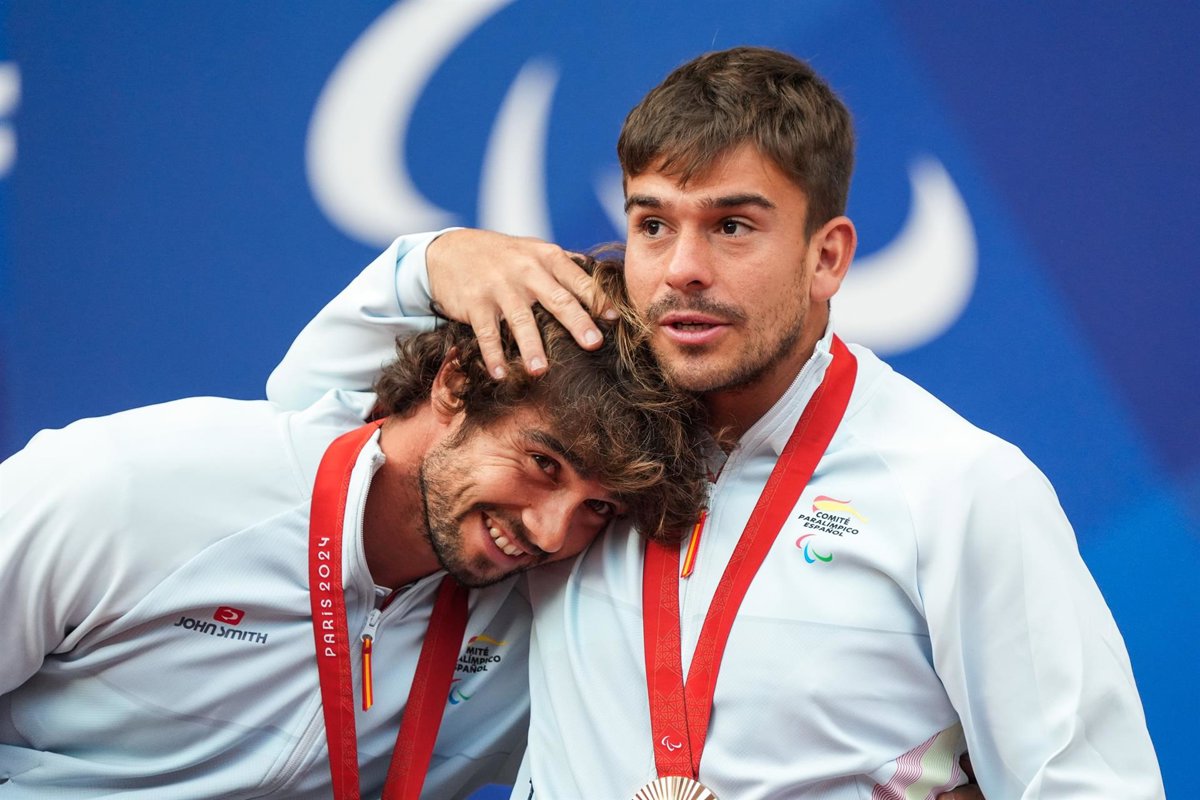 Archivo - Martín de la Puente hace un gesto de cariño a Dani Caverzaschi en el podio de los Juegos Paralímpicos de París - MIKAEL HELSING/CPE - Archivo
