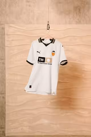 Combinación entre lo tradicional y lo moderno, la prenda encarna la grandeza y la pasión que caracterizan al Valencia CF y al valencianismo. El clásico color blanco se mantiene como protagonista en la camiseta y presenta detalles en negro tanto en el cuello, que cuenta con un diseño de polo, como en los acabados de las mangas, además de toques de color arena que se repiten en los pantalones y en las medias.