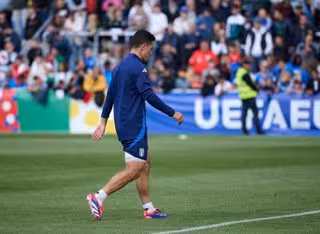 11 June 2024, North Rhine-Westphalia, Iserlohn: Italy's Giacomo Raspadori walks across the pitch with a bandaged thigh during the Italian national soccer team's training session in Iserlohn, in preparation for the UEFA EURO 2024. Photo: Bernd Thissen/dpa - Bernd Thissen/dpa