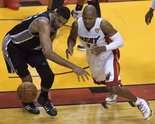 San Antonio Spurs' Tim Duncan chases a loose ball with Miami Heat's Ray Allen du