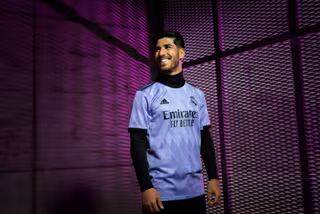 El futbolista Marco Asensio posa con la camiseta visitante del Real Madrid para la temporada 2022-2023.