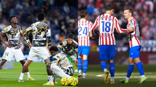 A la izquierda, Aurélien Tchouaméni, Arda Güler y Vinícius Júnior calientan con el Real Madrid; y a la derecha, Marc Pubill y Antoine Griezmann (Atlético de Madrid).