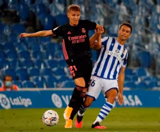 El francés sorprendió de inicio con la ausencia de Casemiro en el once para formar un doble pivote con Kroos y Modric, y la presencia de Odegaard en su vuelta a 'casa' como enganche con Benzema. El campeón se hizo pronto con el control del partido y obligó a la Real, superada e incapaz de salir de la presión, a meterse atrás, aunque Remiro no tuvo excesivos agobios.