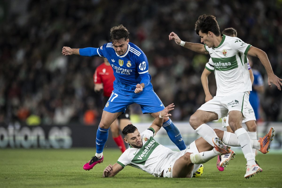 Archivo - Raul Asencio of Real Madrid CF and Rafa Mir of Elche CF in action during the Spanish league, La Liga EA Sports, football match played between Elche CF and Real Madrid C.F. at Manuel Martinez Valero Stadium on November 23, 2025 in Elche, Spain. - Francisco Macia / AFP7 / Europa Press - Archivo
