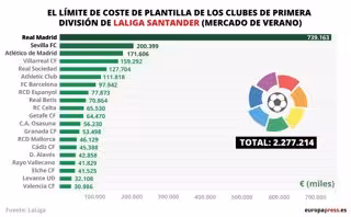 El Real Madrid sigue siendo el club de LaLiga Santander que puede gastar más en salarios, hasta un máximo de 739,1 millones de euros, en esta temporada 2021-22 por delante del Sevilla (200) y el Atlético de Madrid (171), mientras que el FC Barcelona ha descendido del segundo al séptimo lugar, con casi 98 millones.