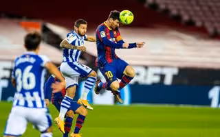 El jugador del FC Barcelona Leo Messi cabeceo el balón en un instante del partido de LaLiga Santander entre el equipo blaugrana y la Real Sociedad, en el Camp Nou - FCB