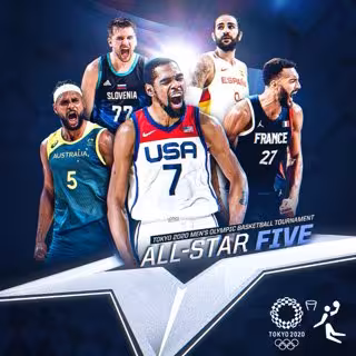 Quinteto ideal de baloncesto en los Juegos Olímpicos de Tokyo 2020, formado por Patty Mills (Australia), Luka Doncic (Eslovenia), Kevin Durant (Estados Unidos), Ricky Rubio (España) y Rudy Gobert (Francia) - FIBA