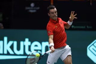 Roberto Bautista Agut of Spain in action against Seong Chan Hong of Korea during the Davis Cup by Rakuten 2022, Finals Group B, tennis match 1 played between Spain and Korea at Fuente de San Luis pavilion on September 18, 2022, in Valencia, Spain. - Oscar J. Barroso / AFP7 / Europa Press