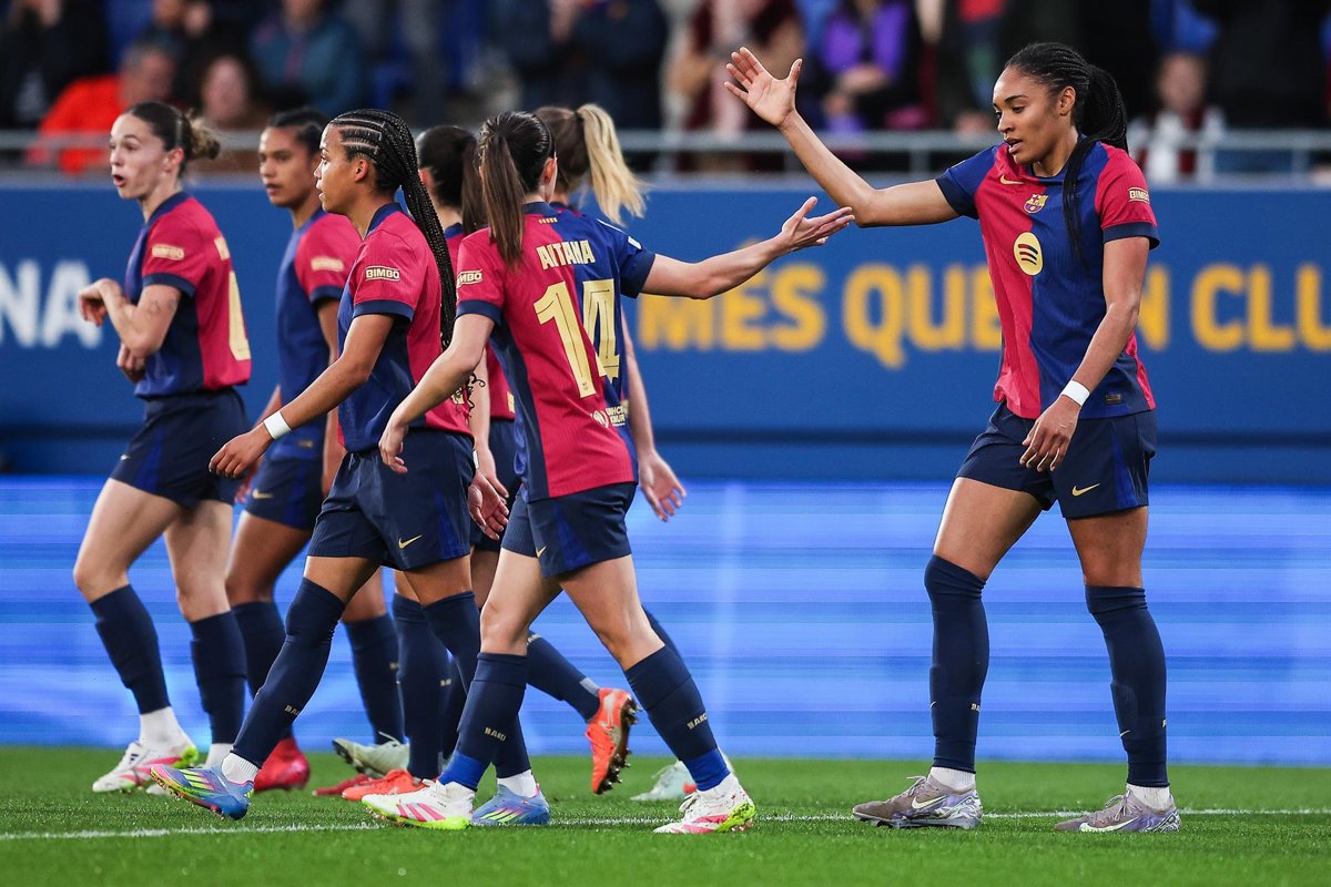 Salma Paralluela celebra con sus compañeros un gol en el triunfo sobre el Wolfsburgo (6-1) en el Estadio Johan Cruyff, en la Liga de Campeones Femenina - FCB