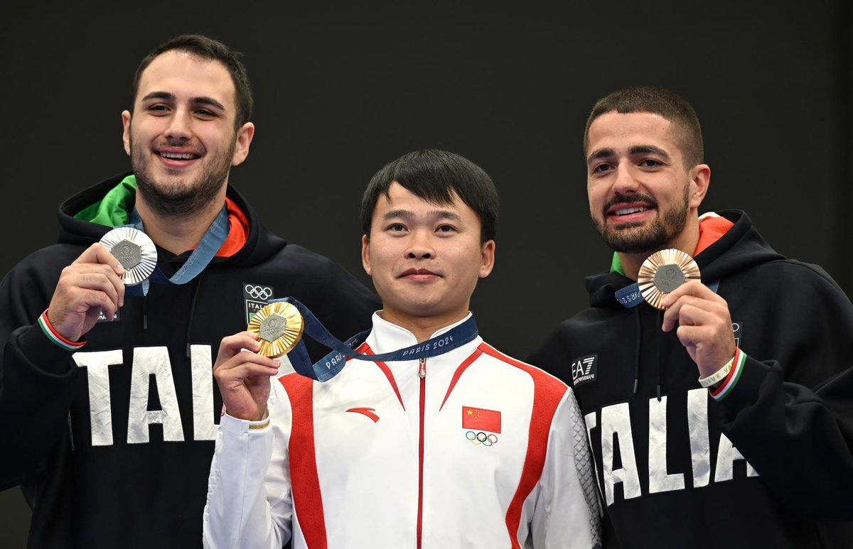 28 July 2024, France, Chateauroux: (L-R) Silver medallist Italy's Federico Nilo Maldini, Gold medallist China's Xie Yu and Bronze medallist Italy's Paolo Monna celebrate on the podium after the shooting 10m air pistol men's final during the Paris 2024 O - Sina Schuldt/dpa