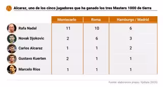 Tenis.-EpData.- (Infografía) Alcaraz, uno de los cinco jugadores que ha ganado los tres Masters 1000 de tierra