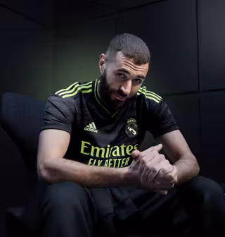 El delantero francés del Real Madrid Karim Benzema con la tercera equipación del equipo blanco para la temporada 2022-23. - ADIDAS