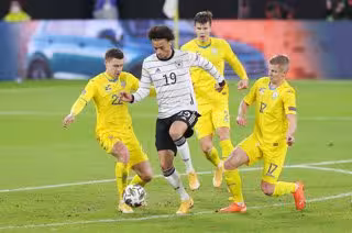 Leroy Sane of Germany and Mykola Matvienko, Eduard Sobol, Oleksandr Zinchenko of Ukraine during the UEFA Nations League, qualifying football match between Germany and Uktaine on November 14, 2020 at Red Bull Arena in Leipzig, Germany - Photo Ralf Ibing