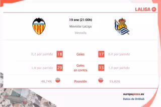El Valencia CF disputa la jornada 20 de LaLiga EA Sports en Mestalla ante la Real Sociedad este domingo a las 21.00 (Movistar LaLiga), un encuentro al que llega tras haber empatado ante el Sevilla, acumulando un punto a los 13 que lleva en la competición. Por su parte, su adversario esta jornada, la Real Sociedad, posee 28 puntos tras sumar otros tres puntos tras ganarle al Villarreal en la pasada jornada.
