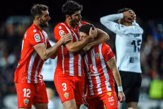 Francisco Portillo of Almeria celebrates a goal with teammates during the spanish league, La Liga Santander, football match played between Valencia CF and UD Almeria at Mestalla stadium on January 23, 2023, in Valencia, Spain. - Ivan Terron / AFP7 / Europa Press