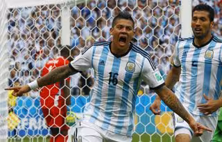 Argentina's Rojo celebrates his goal against Nigeria during their 2014 World Cup