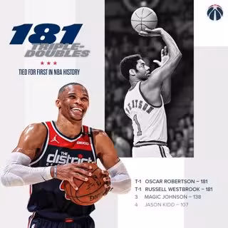 Robertson necesitó 1.046 partidos en 14 temporadas llegar a los 181 'triples-dobles', mientras que Westbrook lo ha logrado en 939 encuentros durante 13 cursos. Solo otros dos jugadores en la historia de la NBA consiguieron más de 100 'triples-dobles' en Fase Regular: Magic Johnson (138) y Jason Kidd (107). El jugador estrella de Los Angeles Lakers LeBron James acumula 99.
