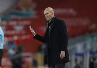 14 April 2021, United Kingdom, Liverpool: Real Madrid manager Zinedine Zidane stands on the sidelines during the UEFA Champions League quarter-finals, second-leg soccer match between Liverpool and Real Madrid at the Anfield. Photo: Darren Staples/CSM vi - Darren Staples/CSM via ZUMA Wire / DPA