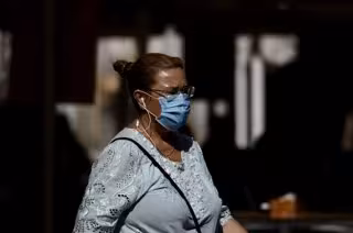 Una mujer camina con mascarilla