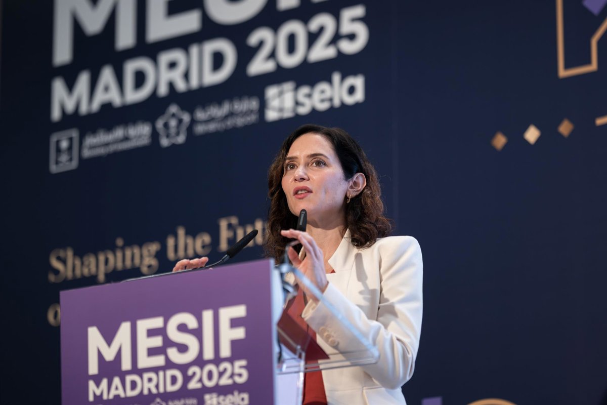 La presidenta de la Comunidad de Madrid, Isabel Díaz Ayuso, interviene en el foro de inversión deportiva de Oriente Medio, Middle East Sports Investment Forum (MESIF), a 7 de noviembre de 2025, en Madrid (España). El foro de inversión, que se celebra en e - Diego Radamés - Europa Press
