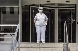 Sanitaria protegida con mascarilla y gorro durante el minuto de silencio en la entrada del Hospital Doctor Peset - Rober Solsona - Europa Press