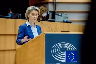 HANDOUT - 10 February 2021, Belgium, Brussels: European Commission President Ursula von der Leyen speaks during a plenary debate on the united EU approach to coronavirus (COVID-19) vaccinations at the European Parliament. Photo: Etienne Ansotte/European - Etienne Ansotte/European Commiss / DPA