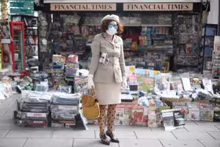 Una mujer protegida con mascarilla y con una revista en su brazo posa al lado de uno de los quioscos de Madrid - Eduardo Parra - Europa Press