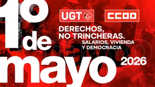 Cartel del 1º de mayo, con el lema para 2026: 'Derechos, no trincheras. Salarios, vivienda y democracia' - UGT/CCOO